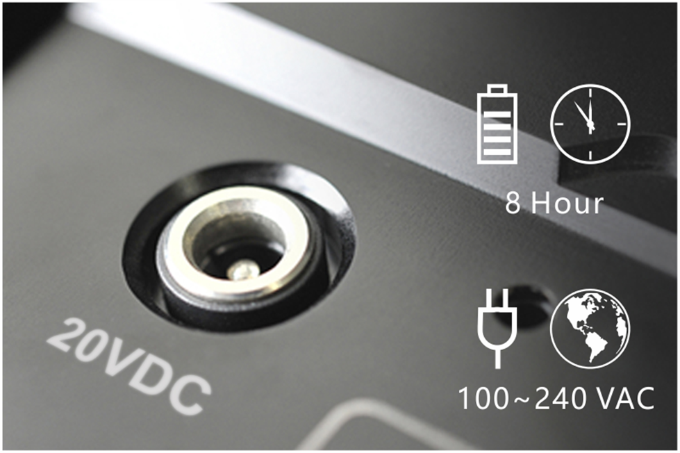 | 全球通用的100~240 VAC输入 内置锂聚合物电池,可持续工作8小时 |